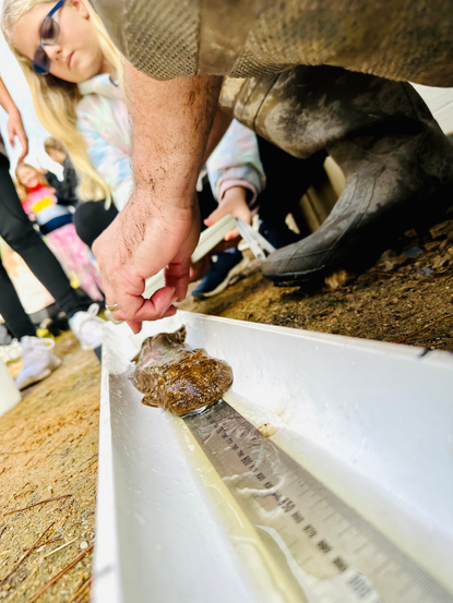 As students continued exploring and researching about hellbenders, Defenders of Wildlife helped to facilitate a connection with the NC Wildlife Resource Commission in a visit to the Marion State Fish Hatchery. While at the hatchery students got the chance to get their hands wet and assist the hatchery with their winter inventory of their hellbender population. The fieldwork included touring the trout facility, exploring endangered mussel species raised there, participating in a wildlife identification activity lead by Defenders, and measuring the hellbenders.