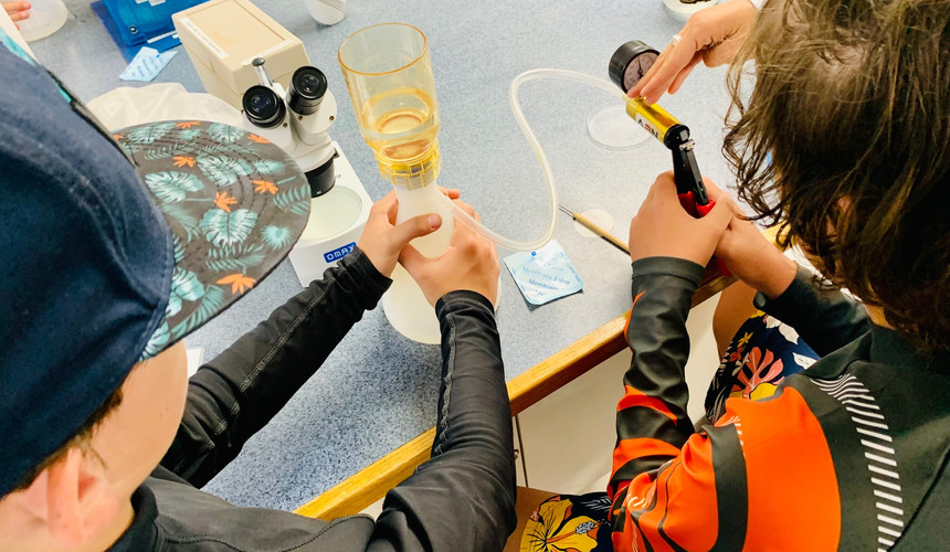 Once we returned back to Marine Lab we had an hour until dinner to organize ourselves and start writing this blog. After we wrote some of the blog it was time for a dinner of meatloaf, corn, mashed potatoes, and a delicious dessert of pudding. After we had that amazing dinner we had about 30 minutes to play volleyball. There is a court in the main building that students can use with other groups while you are there. Then we met in the blue lab for a science lab about microplastics. During the lab we learned about how important it is to be aware of what you are using in your everyday life, because even the most tiny amounts of plastic can end up in our natural environment.